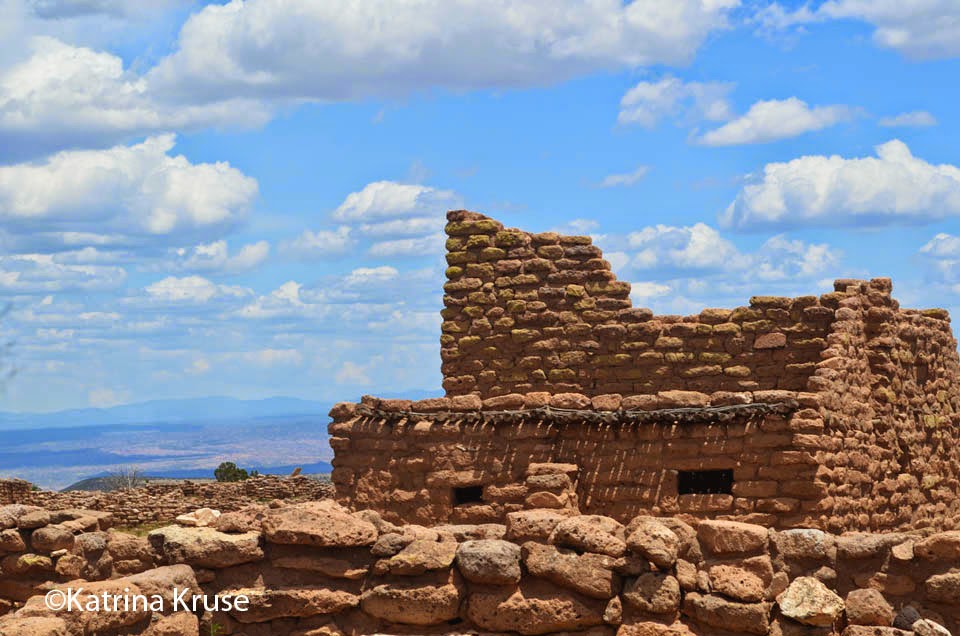 Up on top of the mesa the temperature dropped and the wind picked up. From up top you could see forever! He explained that the cliffs were used in the winter and people moved up top during the warmer months. We saw ruins of hundreds of rooms that would have been the first floor of multi-story pueblos with a plaza in the center. A partially reconstructed building sits among the ruins and a ceremonial kiva that is original except for the roof rounded out the tour. It is the stories and personal knowledge that made this a wonderful experience. Seeing how people lived and seeing/hearing how a culture is passed on and preserved is simply a great thing. Our guide spoke his Pueblo's language and explained how it is being passed on. He explained the relationship his Pueblo has/had with other Pueblos. "Puye" means a place where rabbits gather - we saw lots of evidence of that up on the mesa! Like many parks/monuments etc there is a visitor's center with artifacts displayed and a video of Elija talking about learning pottery making with his mother and daughter. It is the personal experience and desire to educate that made this place come alive!